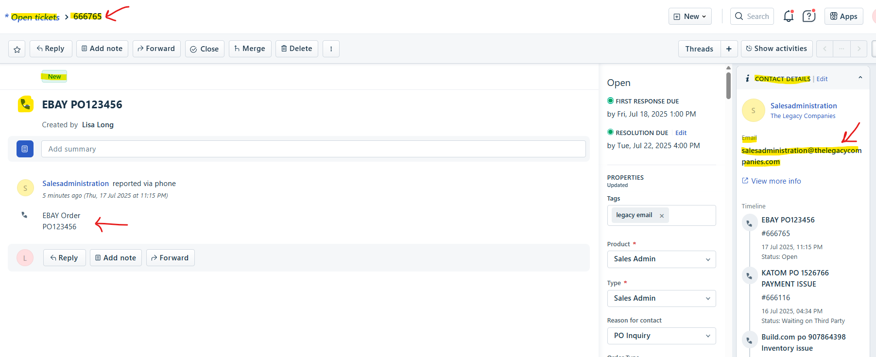 - Threatened orders (In House Ticket) -> enter email address : salesadministration@thelegacycompanies.com