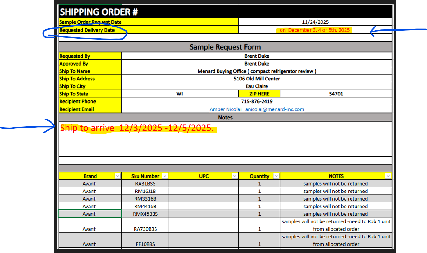 | Who will I receive Sample Order Requests From? | Hunter Stephens Jeff Kuehn Christi Stillmark Brent Duke Caitlin Windsor Ben George 9/29/2025: added below names to the list: Deborah Montella | * |
