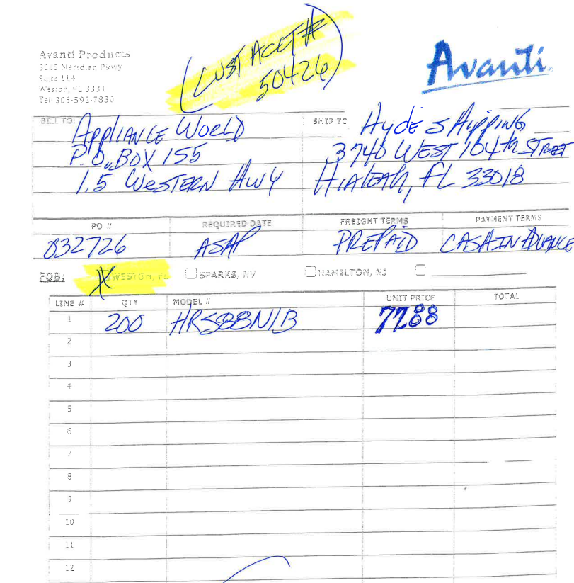 | 50375 | SOUTH FLORIDA APPLIANCE | Export | Mario Rosen | Net 30 | CPU | CPU | CPU | |