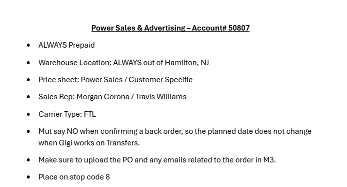| If any special notes are indicated in bode of ticket or on PO | Add to the Special Notes section on the M3 order | |