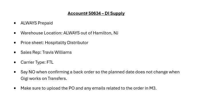 | If any special notes are indicated in bode of ticket or on PO | Add to the Special Notes section on the M3 order | |