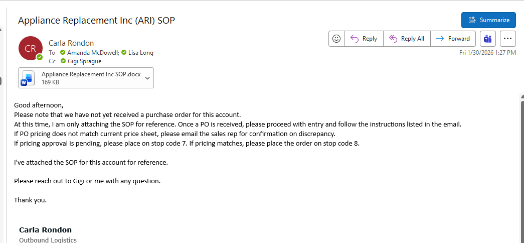 1/30/2026: Account was transitioned over to OP360 Sales Admin to Handle