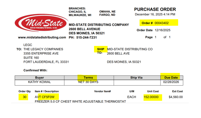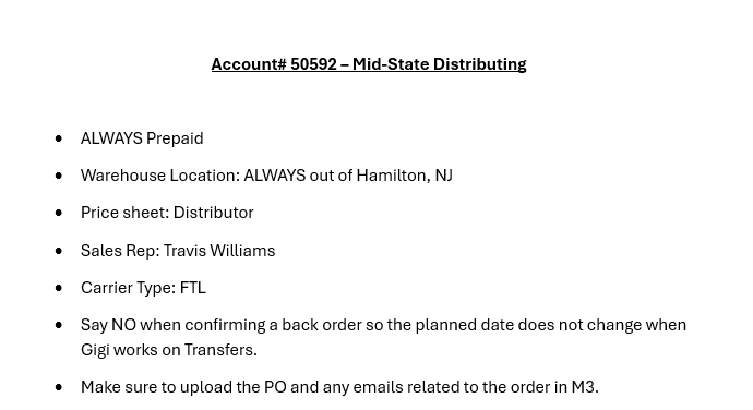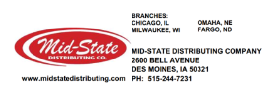 | The trigger to know I am processing under correct Customer ID | The PO will have the Red Emblem & Reflect Mid-State Distributing CO ![]() |
